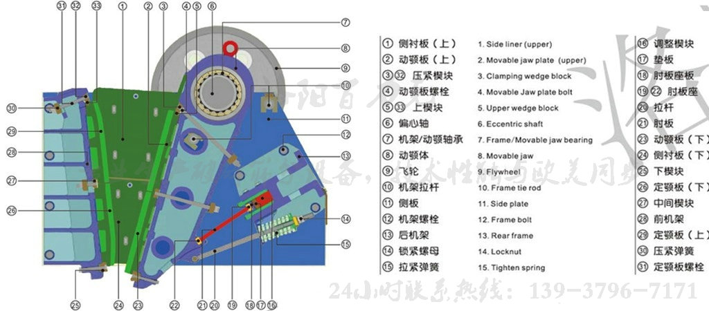 1. 顎式破碎機的排料口采用液壓設計,方便調整。雙楔塊排料口調整系統比老式的調整更簡單、更安全、更快捷。通過隨機提供的專用工具,幾分鐘內即可完成對排料口的調整。該系統對于由于停電導致系統帶負載停機而需要清腔時尤其有效。