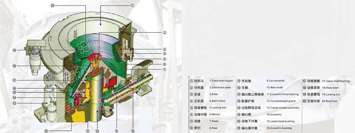 HPM系列多缸液壓圓錐破碎機在工作時通過電動機的旋轉帶動帶輪或聯軸器、 傳動軸和圓錐部在軸心線下使偏心軸做周期性旋擺運動。在物料從料口進入破碎腔后因受到偏心軸和軋臼壁的相互沖擊擠壓、研磨、揉搓從而產生破碎的作用。液壓保險系統能在機器發生過鐵故障或者悶車現象時通過液壓將支撐套和定錐部頂起排除出故障物,在起到很好的保險作用的同時大大的降低了維修率及提高生產效率。